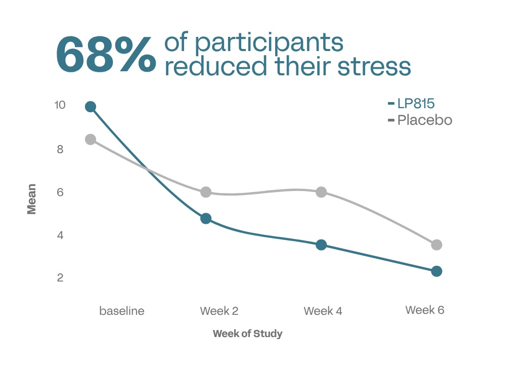 Those taking LP815 reduced their stress by 6.68 points, compared to 4.42 in the placebo group, reflecting a 151% greater improvement.