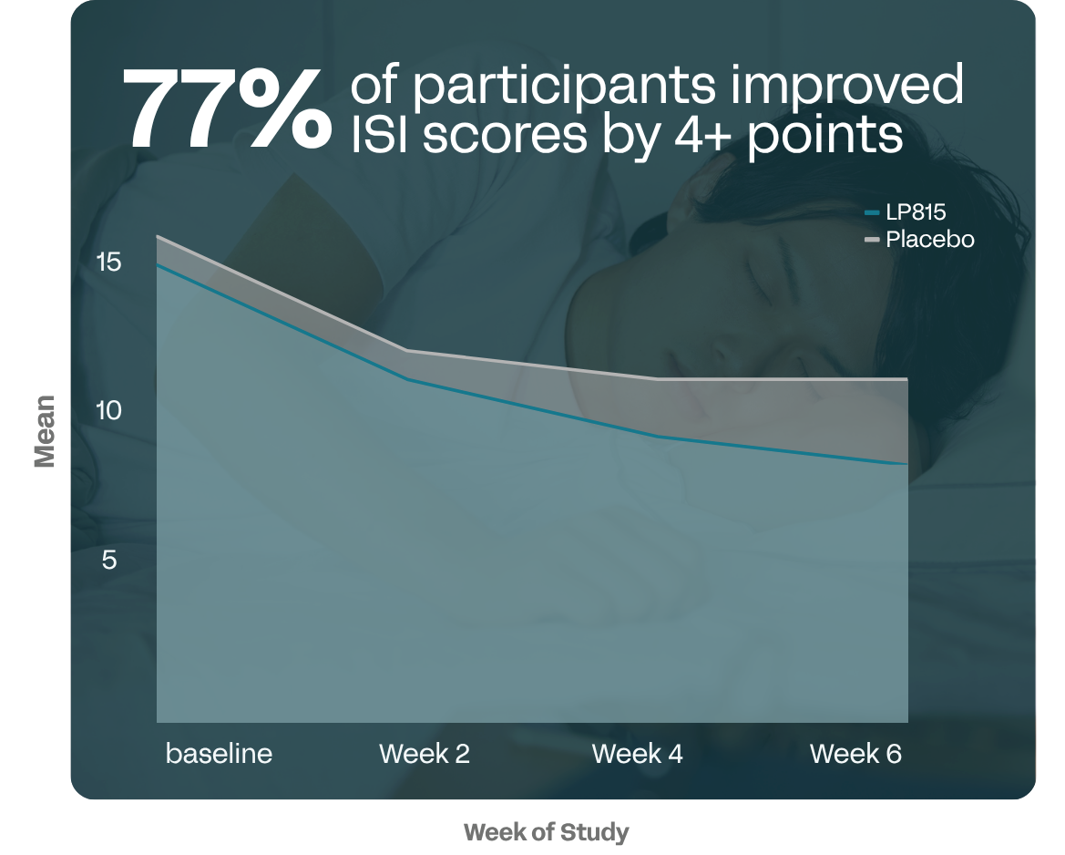 Participants who received LP815 at the 5 billion CFU dosage exhibited significantly lower insomnia index scores at 6 weeks compared to the placebo group (p=0.02). 77.3% of participants in the LP815 cohort exhibited improvement by 4+ points at week 6.